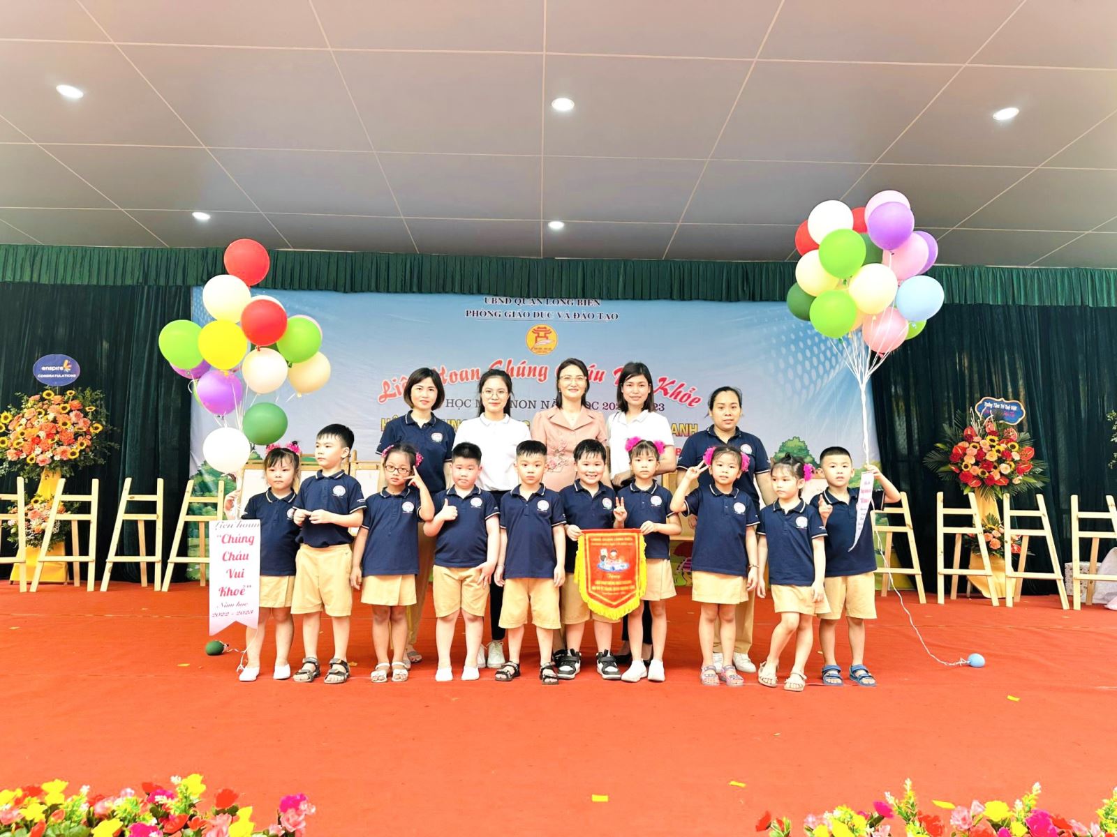 Thực hiện kế hoạch số 10/KH-PGD&ĐT ngày 7/4/2023 của PGD & ĐT Quận Long Biên về kế hoạch tổ chức “ Liên hoan chúng cháu vui khỏe cấp hoc mầm non Quận Long Biên năm học 2022- 2023. Với mục đích tạo cơ hội giao lưu học hỏi cho trẻ mẫu giáo 5-6 tuổi giữa các nhà trường đồng thời tạo sân chơi văn hóa, trí tuệ lành mạnh, bổ ích chuẩn bị tâm thế tốt nhất cho trẻ vào học lớp 1.Hội thi“Liên hoan chúng cháu vui khỏe cấp quận năm học 2022- 2023” đã tạo cơ hội cho các bé được nâng cao kỹ năng sống giúp các bé mạnh dạn, tự tin trong giao tiếp, rèn luyện tố chất nhanh – mạnh – khéo léo .