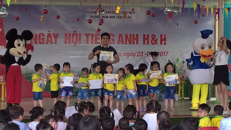 Làm quen tiếng Anh là một hoạt động bổ ích đối với trẻ nhỏ. Thông qua các hoạt động vừa chơi, vừa học trẻ cảm thấy thích thú khi làm quen với tiếng Anh, biết đọc, giao tiếp đơn giản bằng tiếng Anh. Từ đó trẻ mạnh dạn, tự tin hơn, tạo điều kiện thuận lợi cho các con trong các cấp học sau này. Trung tâm H&H phối hợp với trường mầm non Thạch Cầu tổ chức Ngày hội tiếng Anh cho toàn thể các bé khối mẫu giáo .Ngày hội tiếng Anh đã đem đến một sân chơi bổ ích, lý thú cho các con với các tiết mục văn nghệ, giao lưu với người nước ngoài, các trò chơi ... vừa để củng cố một phần những kiến thức các con tiếp thu được vừa giúp các con mạnh dạn, tự tin trong giao tiếp. Ngày hội tiếng Anh thật sự mang những niềm vui lớn cho các con.