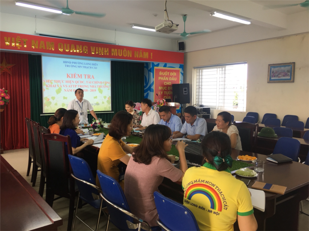 Đoàn kiểm tra HĐND phường Long Biên do đ/c Ngô Văn Phách – chủ tịch Hội đồng nhân dân Phường Long Biên làm trưởng đoàn cùng các đồng chí của các ban ngành, bộ phận kiểm tra về công tác thực hiện quy chế dân chủ, tài chính công khai và VS ATTP trong nhà trường năm học 2017-2018 và năm học 2018-2019. Trong buổi kiểm tra , các đồng chí trong đoàn đã kiểm tra toàn bộ hồ sơ về công khai quy chế dân chủ, công khai tài chính, công tác thu chi và kiểm tra vệ sinh khung cảnh sư phạm nhà trường cũng như vệ sinh các lớp học, các phòng chức năng. Đoàn kiểm tra đánh giá cao công tác chuẩn bị đầy đủ HSSS , việc thực hiện kế hoạch cũng như công tác vệ sinh đảm bảo an toàn, thân thiện, sáng –Xanh-Sạch-Đẹp – Nở Hoa