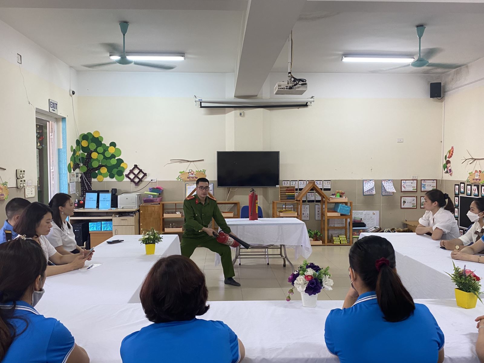Thực hiện kế hoạch nhiệm vụ năm học và kế hoạch thực hiện công tác PCCC cứu nạn cứu hộ trong nhà trường. Căn cứ vào tình hình thực tế hiện nay về công tác phòng cháy , chữa cháy ,cứu nạn cứu hộ tại Hà Nội và địa phương . Sáng ngày 25/07/2022,Trường mầm non Thạch Cầu mời các đồng chí trong đội PCCC số 4 về tổ chức dạy trẻ kỹ năng thoát hiểm khi có đám cháy và phòng cháy chữa cháy, cách sử dụng bình cứu hỏa cho toàn bộ CBGVNV trong nhà trường .Các đồng chí trong đội PCCC đã tập huấn một số kiến thức cơ bản về cháy nổ,dạy trẻ cách thoát hiểm, dạy giáo viên, nhân viên cách xử lý đám cháy và sử dụng bình cứu hỏa để chữa cháy và cách thoát nạn khi có đám cháy .