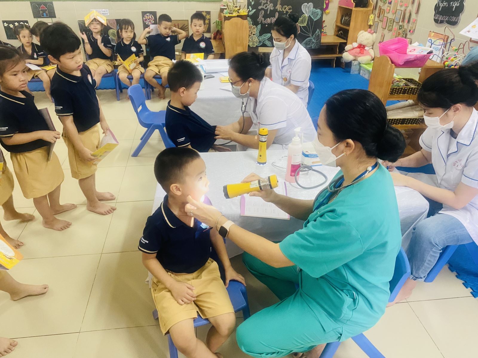 Nhà trường đã phối hợp với Trạm Y tế phường Long biên tổ chức khám sức khỏe cho 100% trẻ với các nội dung kiểm tra: Cân nặng, chiều cao, khám tai, mắt, mũi, họng, kiểm tra tim phổi và một số bệnh liên quan đến đường hô hấp, da liễu, mắt… Mọi công tác chuẩn bị được nhà trường chuẩn bị kỹ lưỡng nên quá trình khám cho trẻ diễn ra thuận lợi, các cháu mạnh dạn, tự tin, hợp tác cùng các bác sĩ của trạm y tế.