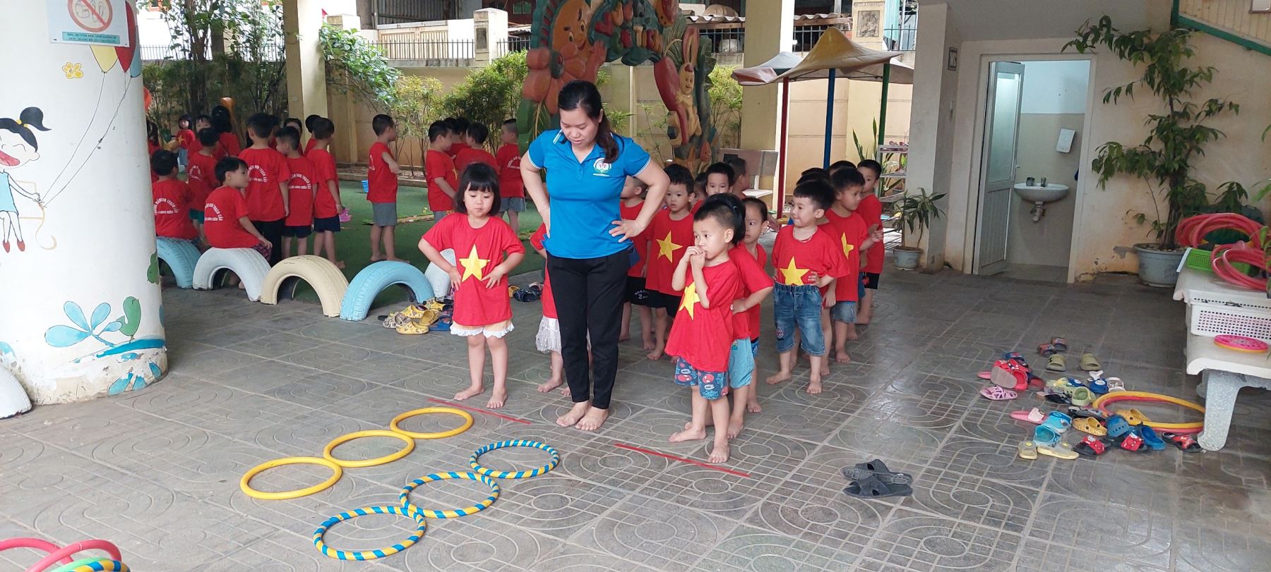 Ngoài các hoạt động giáo dục kĩ năng thì với trẻ giáo dục thể chất đóng vai trò rất quan trọng giúp trẻ khỏe mạnh, tích cực hơn khi tham gia các hoạt động vận động. Với đặc điểm của trẻ rất thích tham gia các trò chơi vận động với đồ dùng đẹp, hấp dẫn giúp trẻ hứng thú hơn, tích cực tham gia hơn vì vậy trong trò chơi Bật qua ô và ném trúng đích cô giáo đã hướng dẫn cách chơi, luật chơi rõ ràng, các con thích thú khi tham gia.