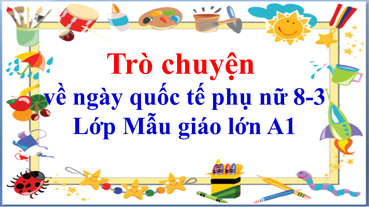Nhân ngày mùng 8/3 không món quà nào quan trọng bằng những thiên thân thần bé nhỏ của các cô. Được giao lưu cùng các con, trò chuyện về ngày 8-3, biết được ý nghĩ của ngày 8/3. Các con được giao lưu với các cô được chơi những trò chơi bổ ích vừa được ôn lại các bài cũ, được gặp cô và các bạn. Thay mặt các cô và các con lớp MGL A1 xin chúc toàn thể các bà, các me, các bác, các cô, các bạn gái luôn xinh đep, mạnh khỏe, bình an và may mắn