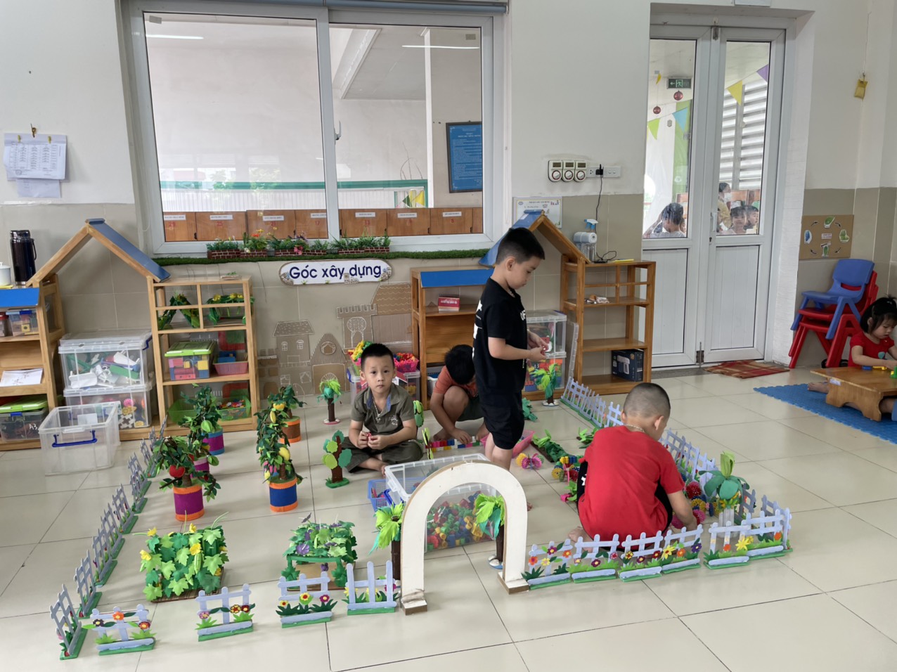 Trẻ tham gia vào các góc chơi ở lớp như: Góc phân vai; Góc kỹ năng tự phục vụ; Góc nghệ thuật (Âm nhạc - Tạo hình); Góc thiên nhiên; Góc học tập - khám phá; Góc sách truyện…Ở mỗi góc chơi trẻ đều được học những kiến thức, kỹ năng khác nhau và quan trọng hơn cả là trẻ có cơ hội được thể hiện mình và biết phối hợp cùng các bạn tham gia các hoạt động.