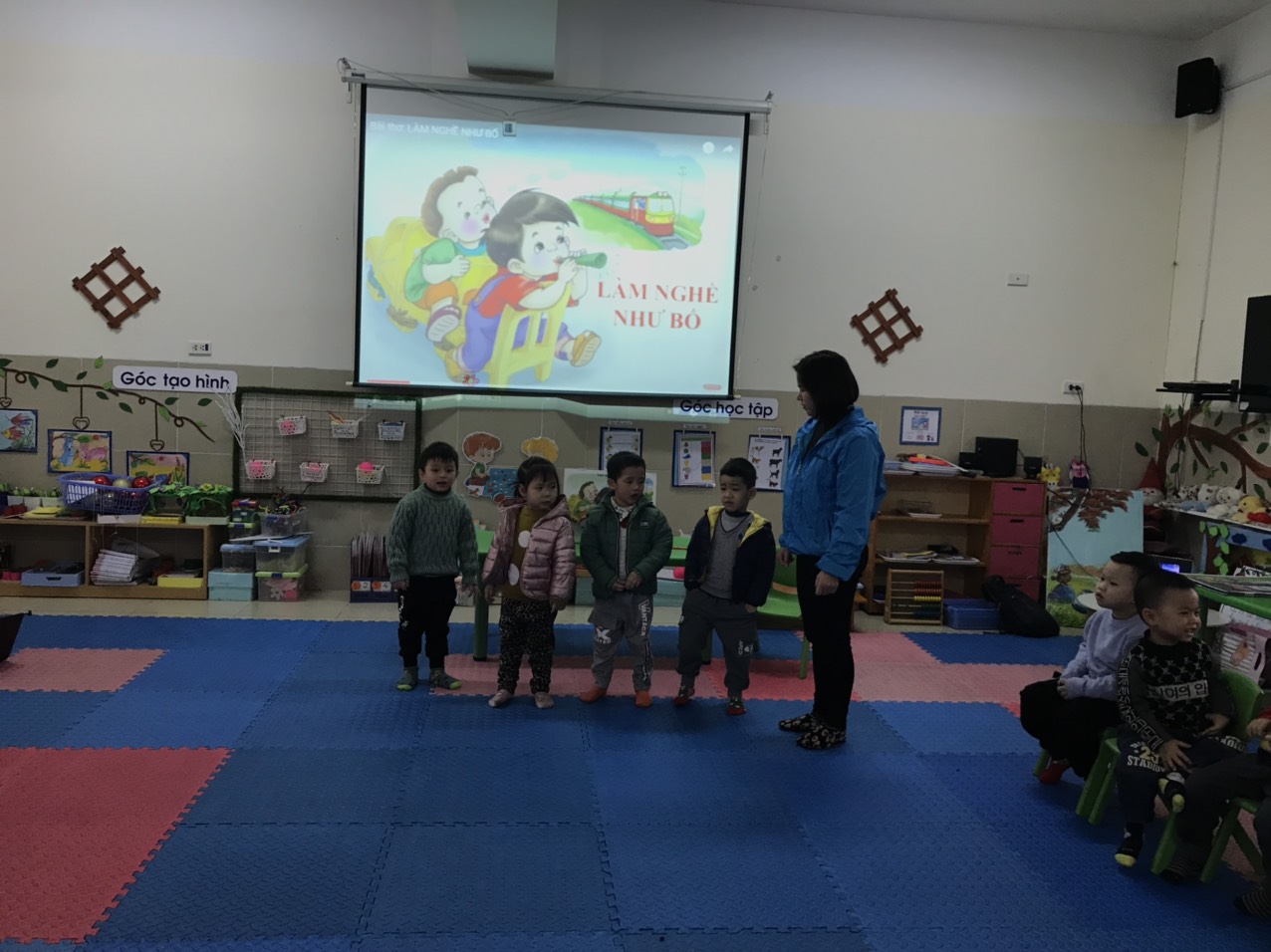 Hôm nay các bé lớp MGB C3 được học bài thơ: Làm nghề như bố . Trẻ nhớ tên bài thơ, hiểu được nội dung bài thơ nói về công việc của bố, được các bạn chơi đóng làm bác lái tàu bằng cách xếp ghế làm đoàn tàu. trẻ đọc thuộc diễn cảm bài thơ, trả lời được 1 số câu hỏi của cô. Trẻ hứng thú tham gia