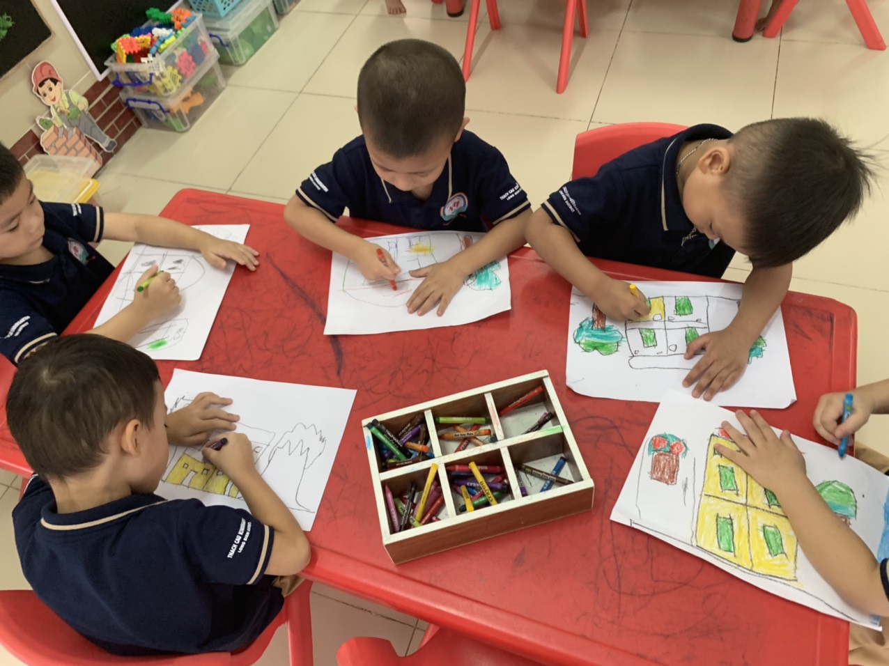 Và hôm nay lớp B2 tổ chức cho các con giờ học:" Vẽ và tô màu tranh trường mầm non" các bé đều hào hứng tham gia
