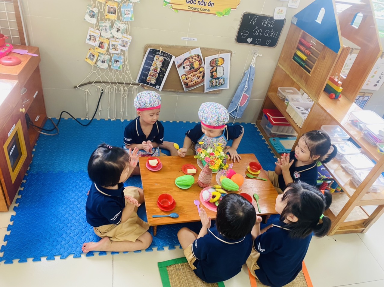 Trẻ tham gia vào các góc chơi ở lớp như: Góc bé chơi đóng vai; Góc ghép hình xây dựng; Góc thư viện sách; Góc tạo hình- âm nhạc; Góc khám phá trải nghiệm…Ở mỗi góc chơi trẻ đều được học những kiến thức, kỹ năng khác nhau và quan trọng hơn cả là trẻ có cơ hội được thể hiện mình và biết phối hợp cùng các bạn tham gia các hoạt động.