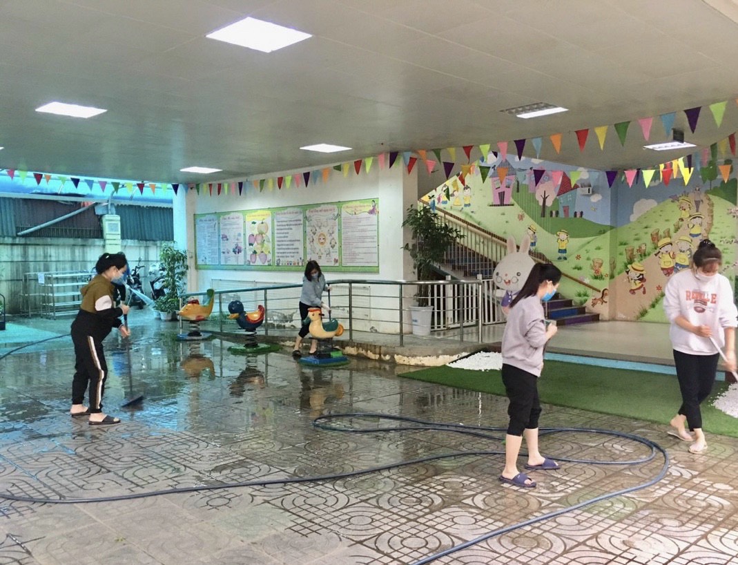 .Thời tiết mùa thu dường như cũng rất ủng hộ cho buổi lao động hôm nay. Yếu tố đầu tiên cần thực hiện là đảm bảo môi trường thoáng sạch và khô ráo. Với phương châm “Đi từng ngõ, gõ từng nhà, rà từng dụng cụ” , các thành viên tham gia buổi tổng vệ sinh đã chia thành các nhóm rà soát từng khu vực trong trường, sắp xếp các đồ dùng, dụng cụ và loại bỏ các yếu tố là nguy cơ trú ngụ, sinh sản của muỗi. Mỗi nhóm triển khai nhanh gọn, kiểm tra kỹ các góc khuất, nơi thoát nước trong khu vực trường. Mọi người cùng nhau quét dọn, cắt tỉa cây xanh, thu gom lá vàng và kiểm tra các đồ chơi ngoài trời; rà soát trong sân trường để dọn dẹp và loại bỏ hoặc úp khô ráo các vị trí và vật dụng bị đọng nước. Tất cả các khu hành lang phòng học, lối cầu thang, góc thiên nhiên các lớp đều được quét dọn sạch sẽ và sắp xếp gọn gàng tránh tối đa khả năng đọng nước làm nơi trú ngụ cho muỗi.