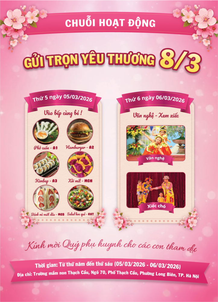 Nhằm chào mừng Ngày Quốc tế Phụ nữ 8/3, Trường Mầm non Thạch Cầu tổ chức chuỗi hoạt động với chủ đề “Gửi trọn yêu thương 8/3” dành cho toàn thể học sinh và phụ huynh trong nhà trường.