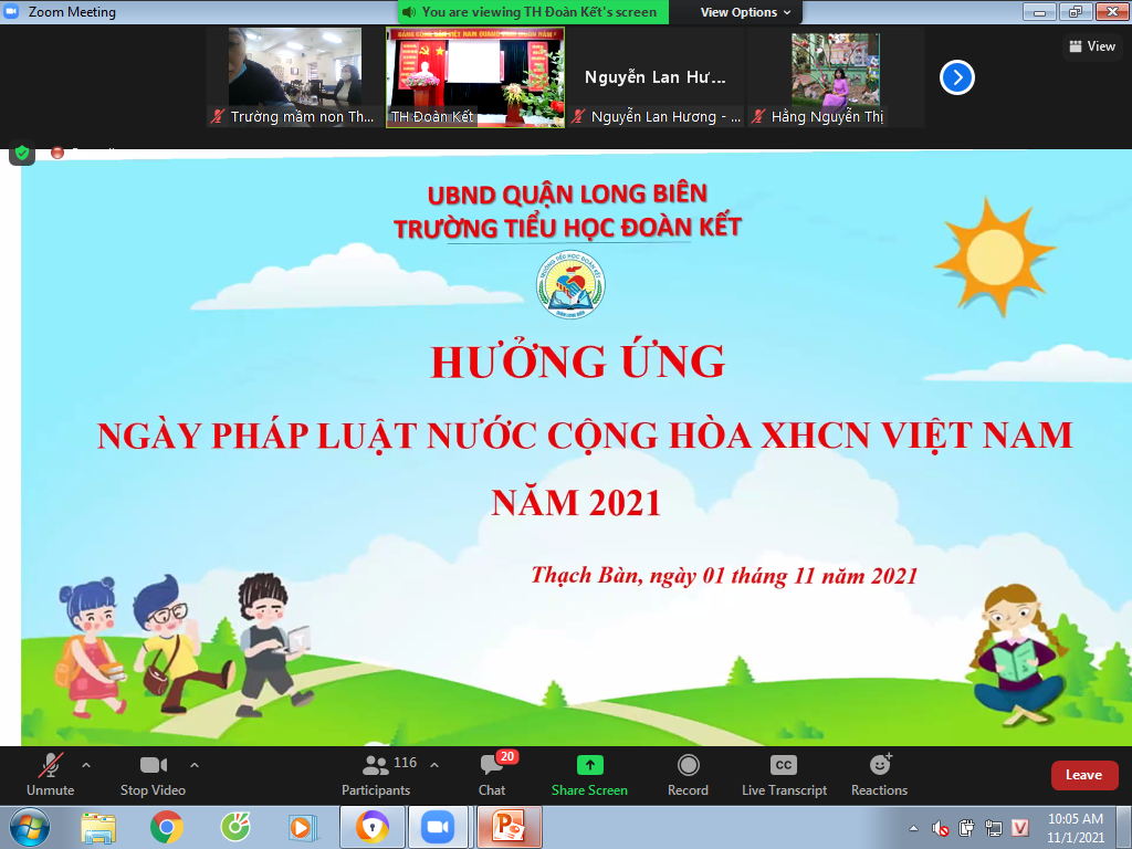 Thực hiện kế hoạch số 218/KH-UBND ngày 05/10/2021 của UBND thành phố Hà Nội, hướng dẫn số 3654/SGD&ĐT - VP ngày 14 tháng 10 năm 2021 của Sở GDĐT về hưởng ứng " Ngày pháp luật nước Cộng hòa xã hội chủ nghĩa Việt Nam" trên địa bàn thành phố Hà Nội năm 2021 ( gọi chung là ngày Pháp luật Việt Nam), hướng dẫn số 195/PGDĐT về việc tổ chức hưởng ứng " Ngày pháp luật nuwocs Cộng hòa XHCNVN" trong Ngành GD&ĐT quận Long Biên năm 2021, sáng ngày 01/11/2021, tại trường Tiểu học Đoàn kết, Phòng GD&ĐT Long Biên đã long trọng tổ chức Lễ hưởng ứng Ngày pháp luật nước CHXHCN Việt Nam năm 2021 trong Ngành Giáo dục và Đào tạo Quận.